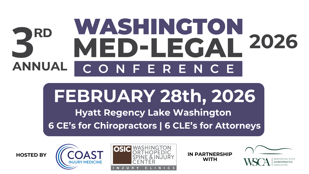 Join Coast Injury Medicine, OSIC, and the WSCA for the 3rd Annual Washington Med-Legal Conference (WMLC). WMLC is the premier medical-legal conference in the Pacific Northwest, bringing together chiropractors, healthcare providers, attorneys, and legal professionals.